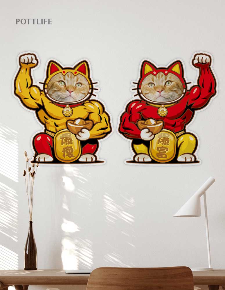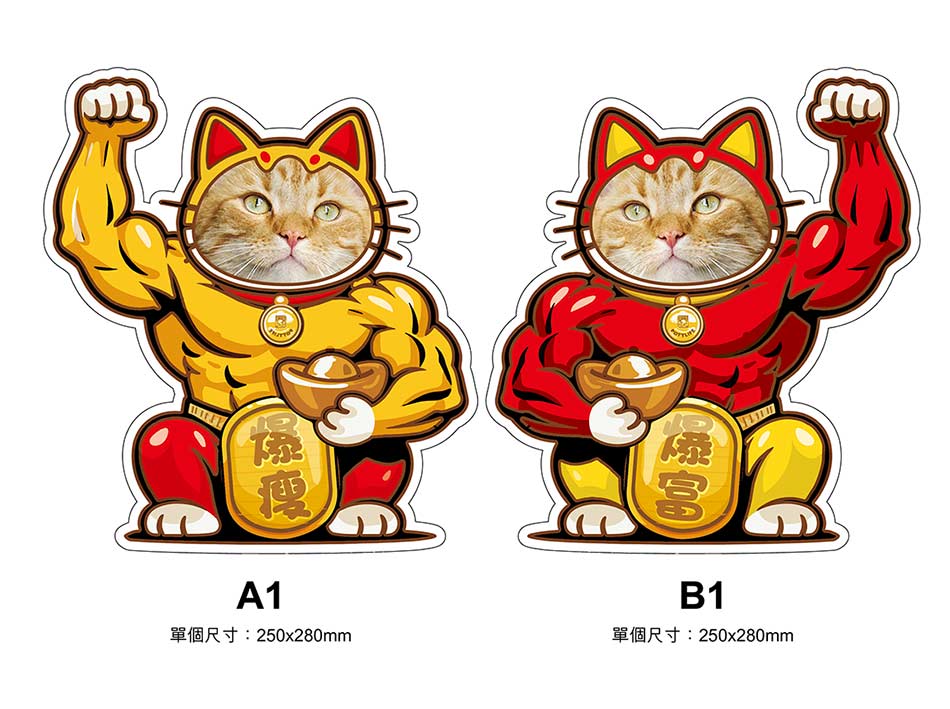 客制化健美版招財貓全身款寵物揮春訂制 (一套兩件) 2026新款;來圖訂製,客制化新年竉物揮春訂制,一件起訂,多種獨特設計,可換上毛孩照片,貓奴狗奴,賀年產品必備。設計獨特,猫猫,狗狗賀年產品,本地設計制作,信心保證。印刷面料為光面PP紙,防水,不易撕裂破損,超耐用。